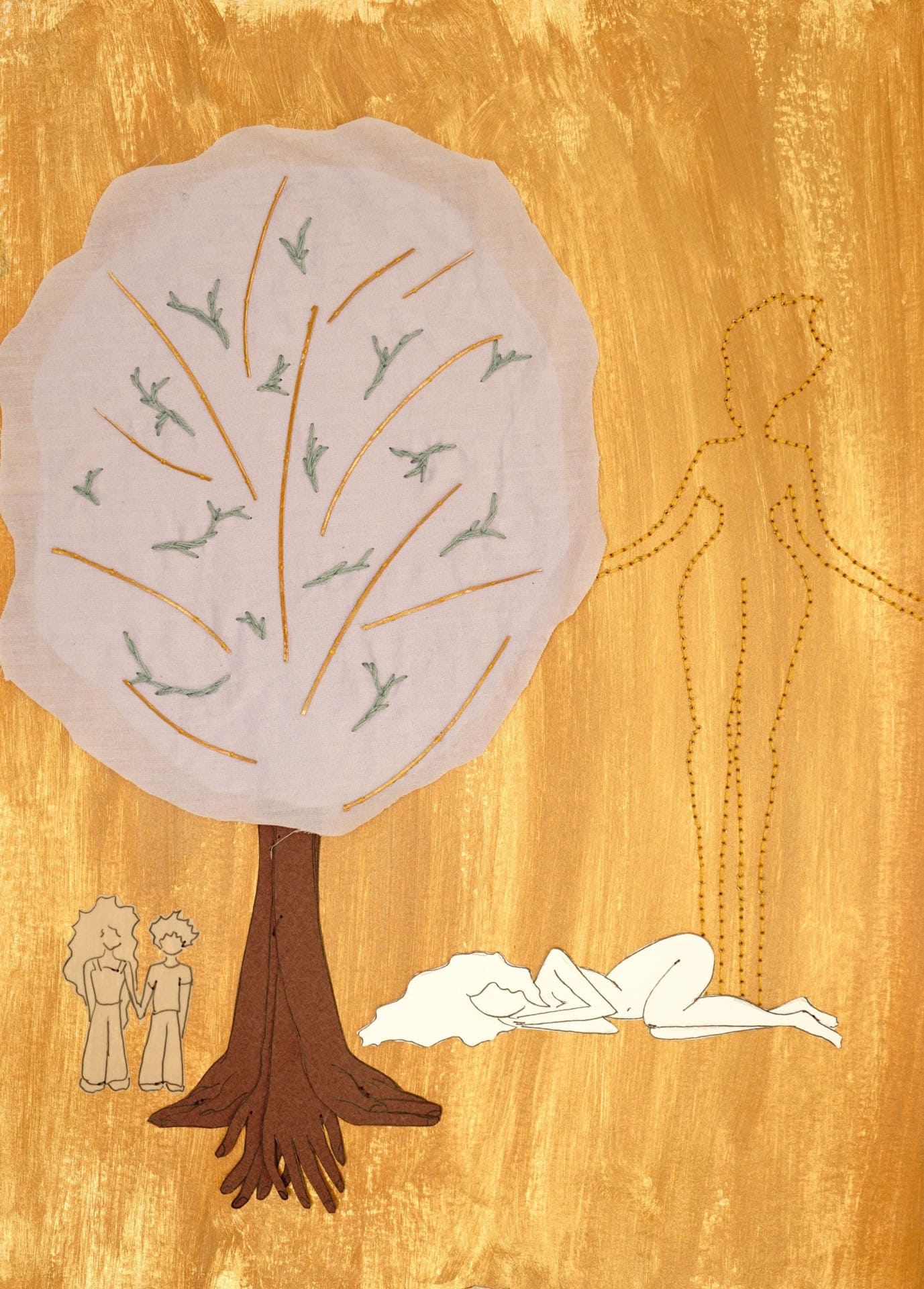 paper, golden acrylic paint, fabric & embroidery - 11''x15''